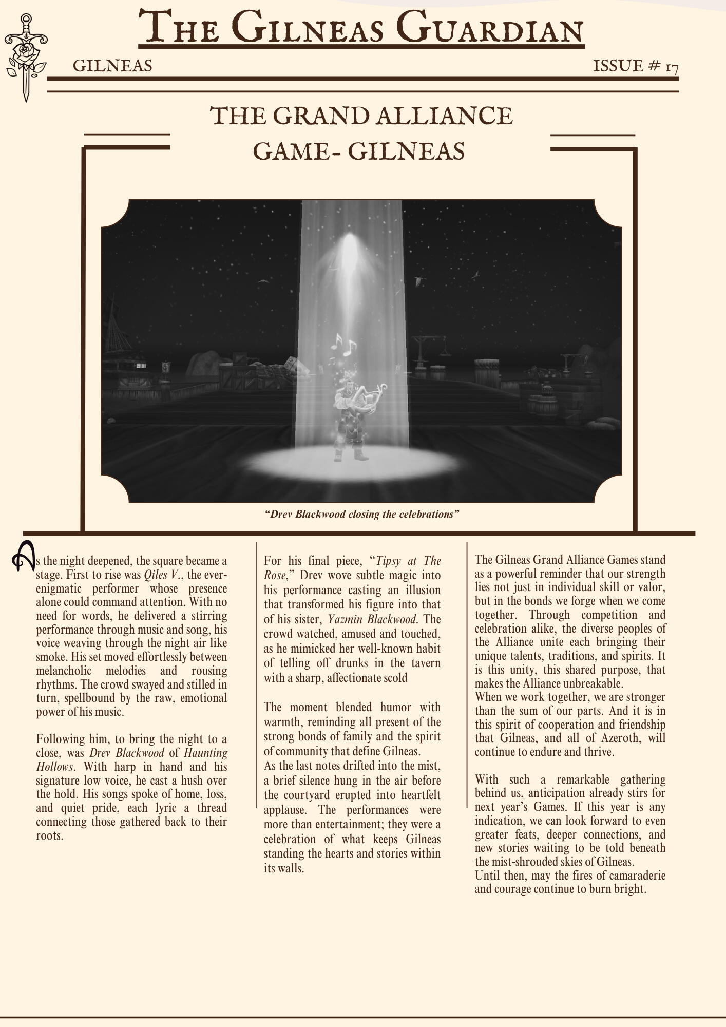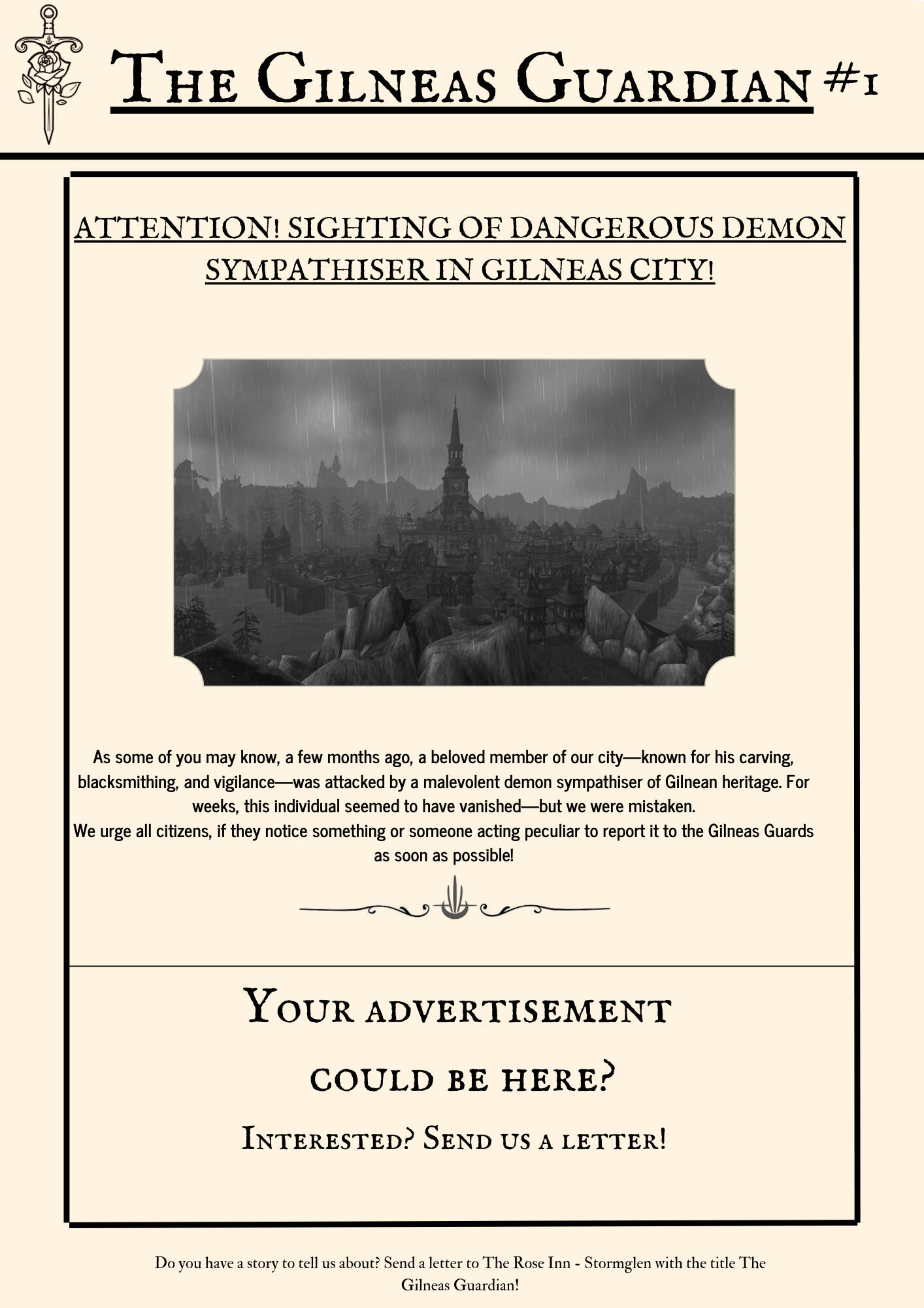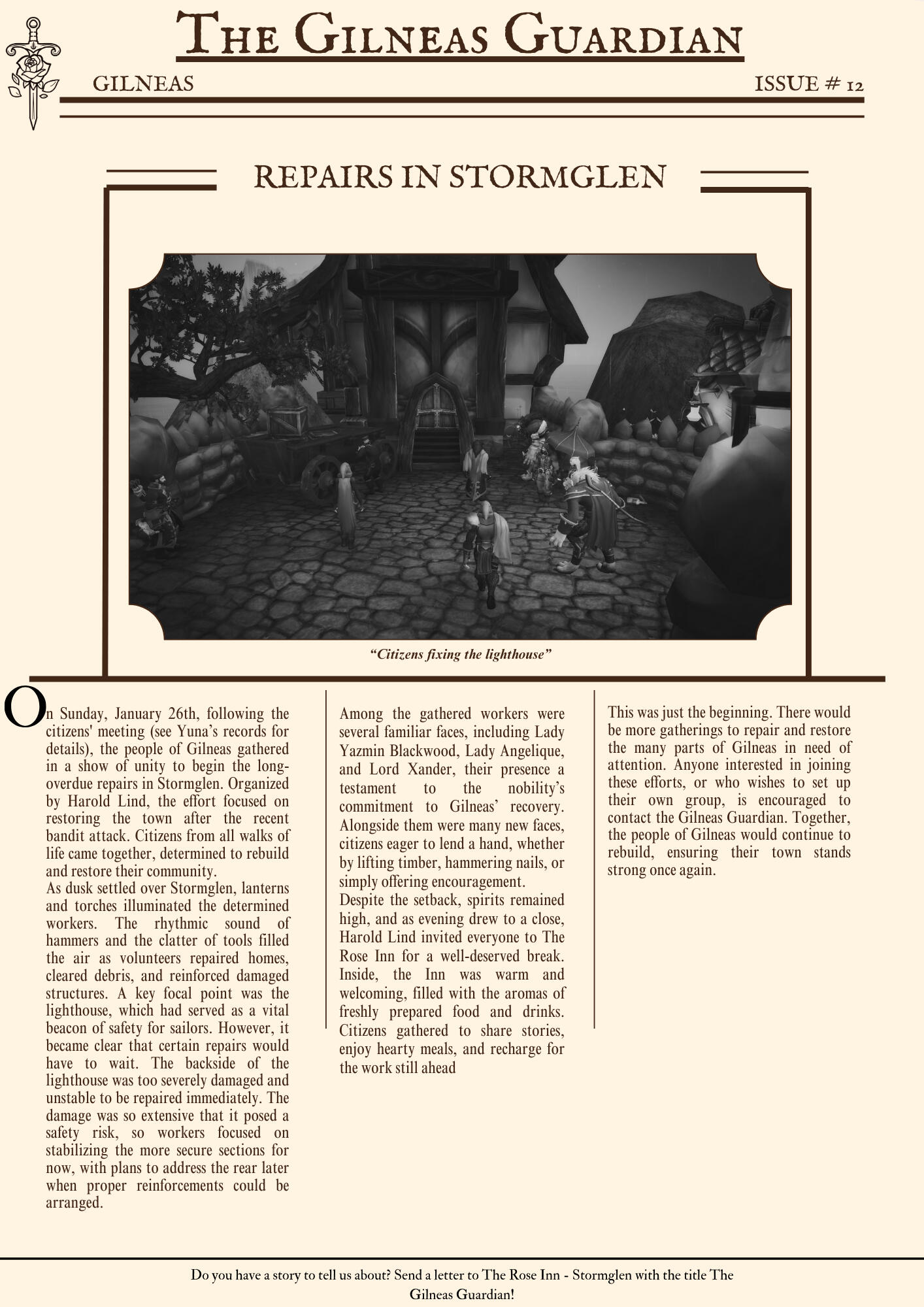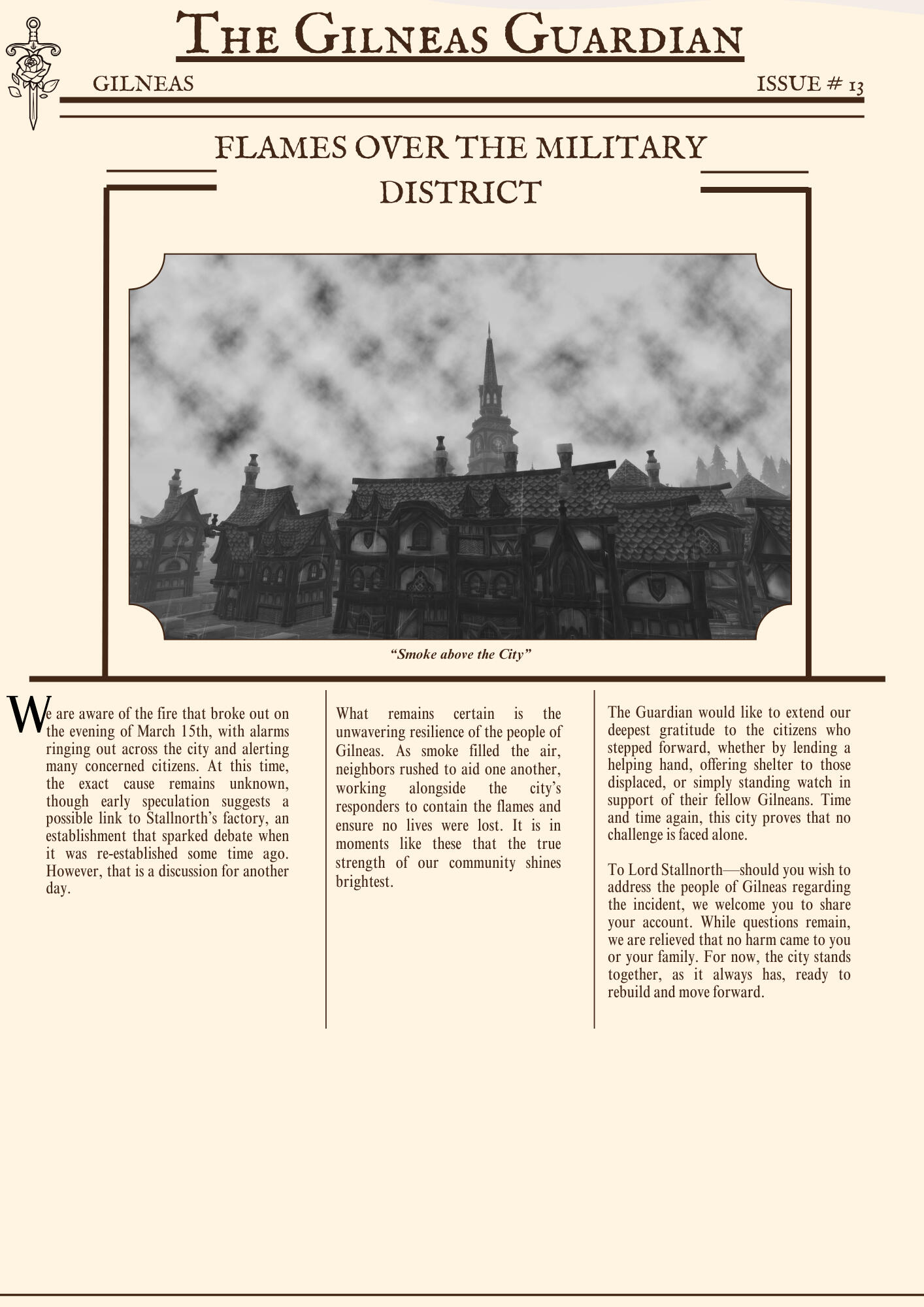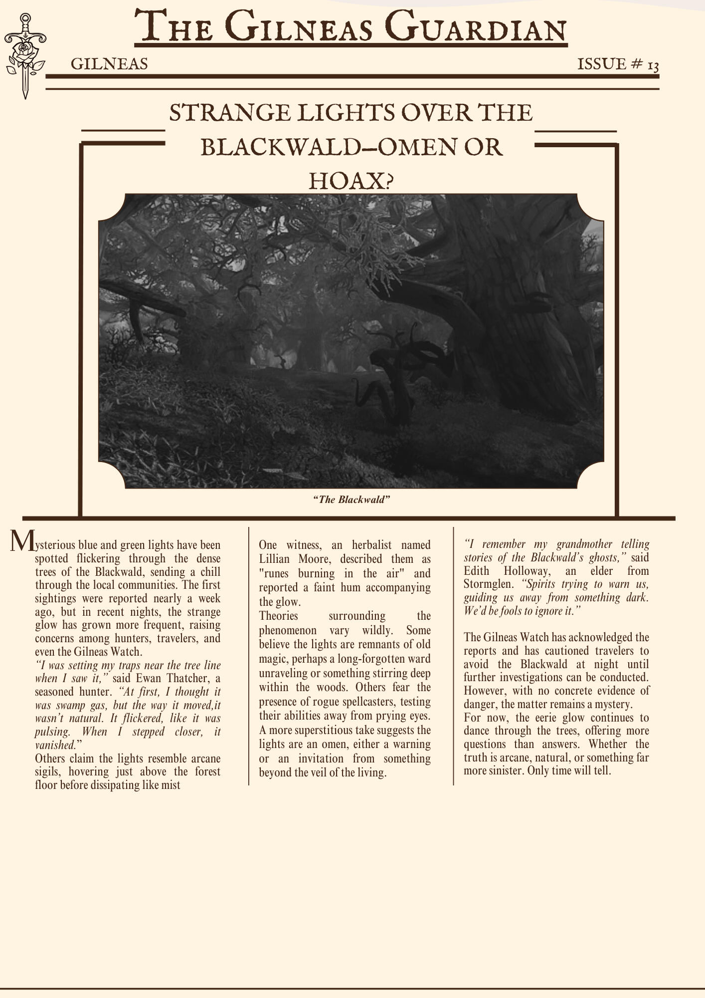 The Gilneas Guardian is dedicated to delivering truthful news and reporting on events in and around the city of Gilneas. Our mission is to keep citizens informed about the latest developments, ensuring the community stays aware and engaged with the world around them.