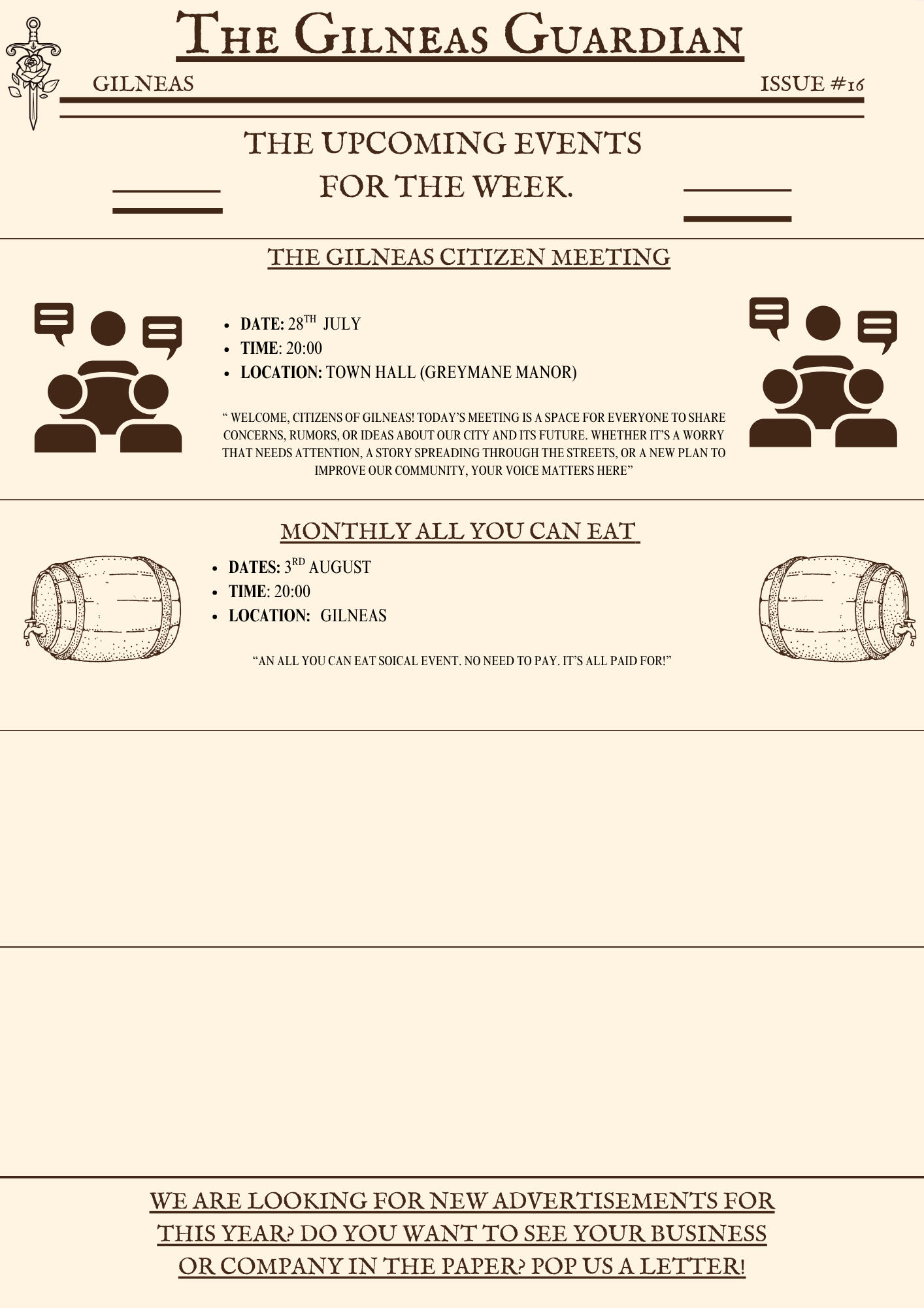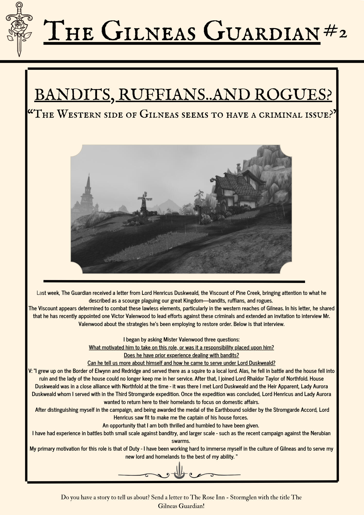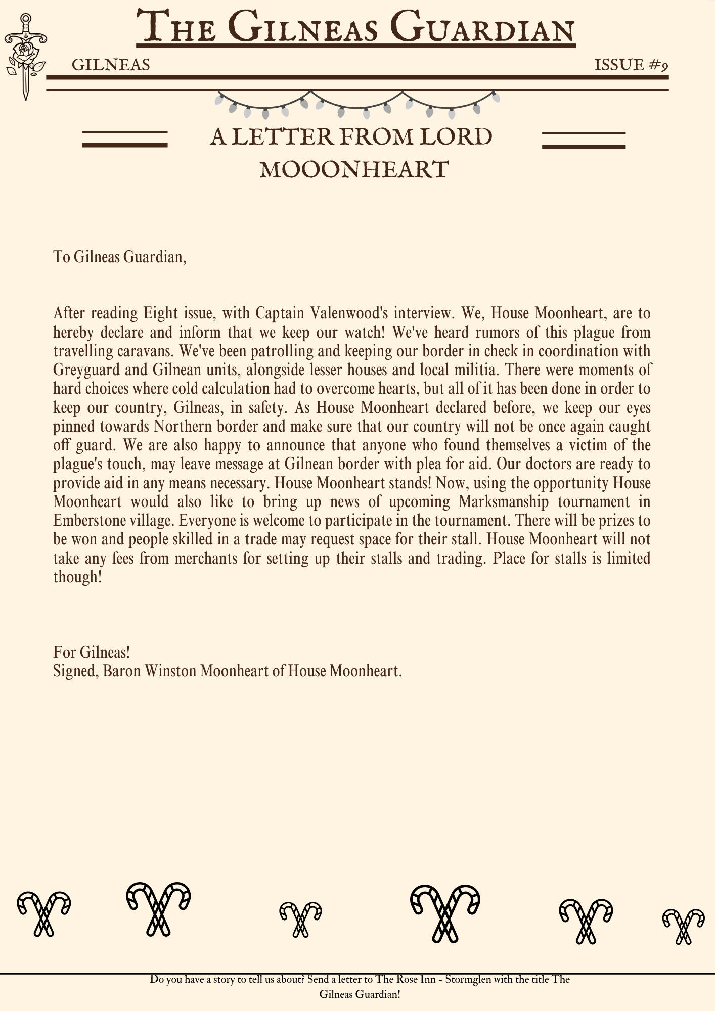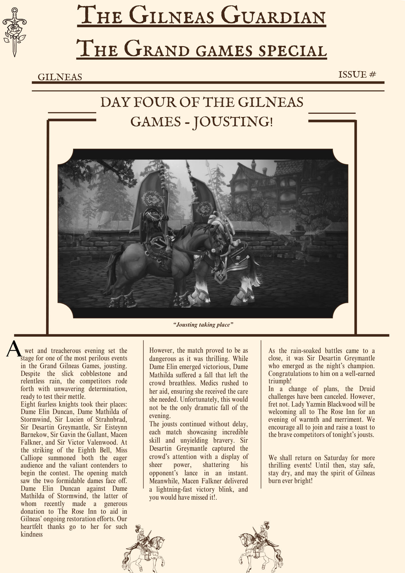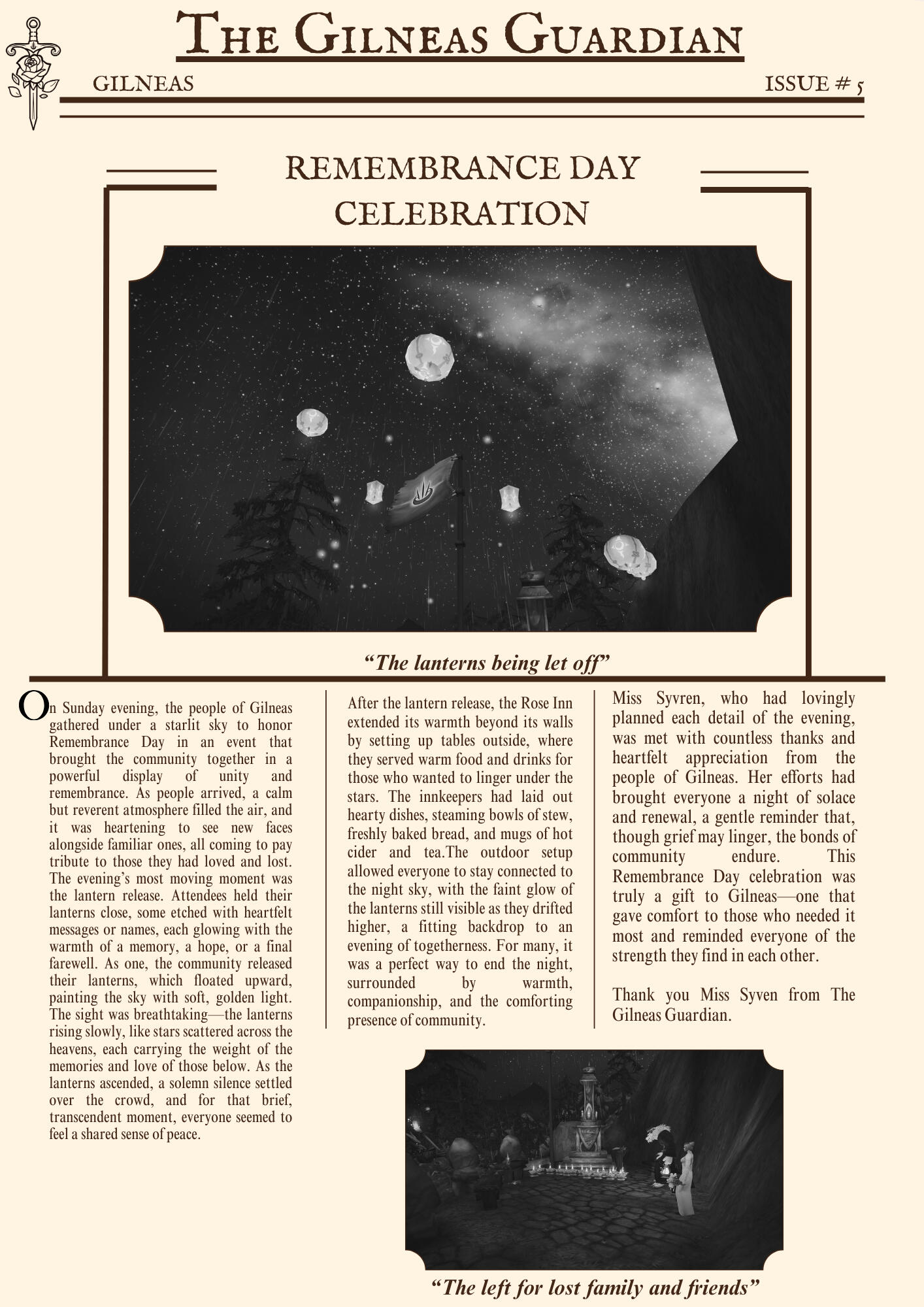 The Gilneas Guardian is dedicated to delivering truthful news and reporting on events in and around the city of Gilneas. Our mission is to keep citizens informed about the latest developments, ensuring the community stays aware and engaged with the world around them.