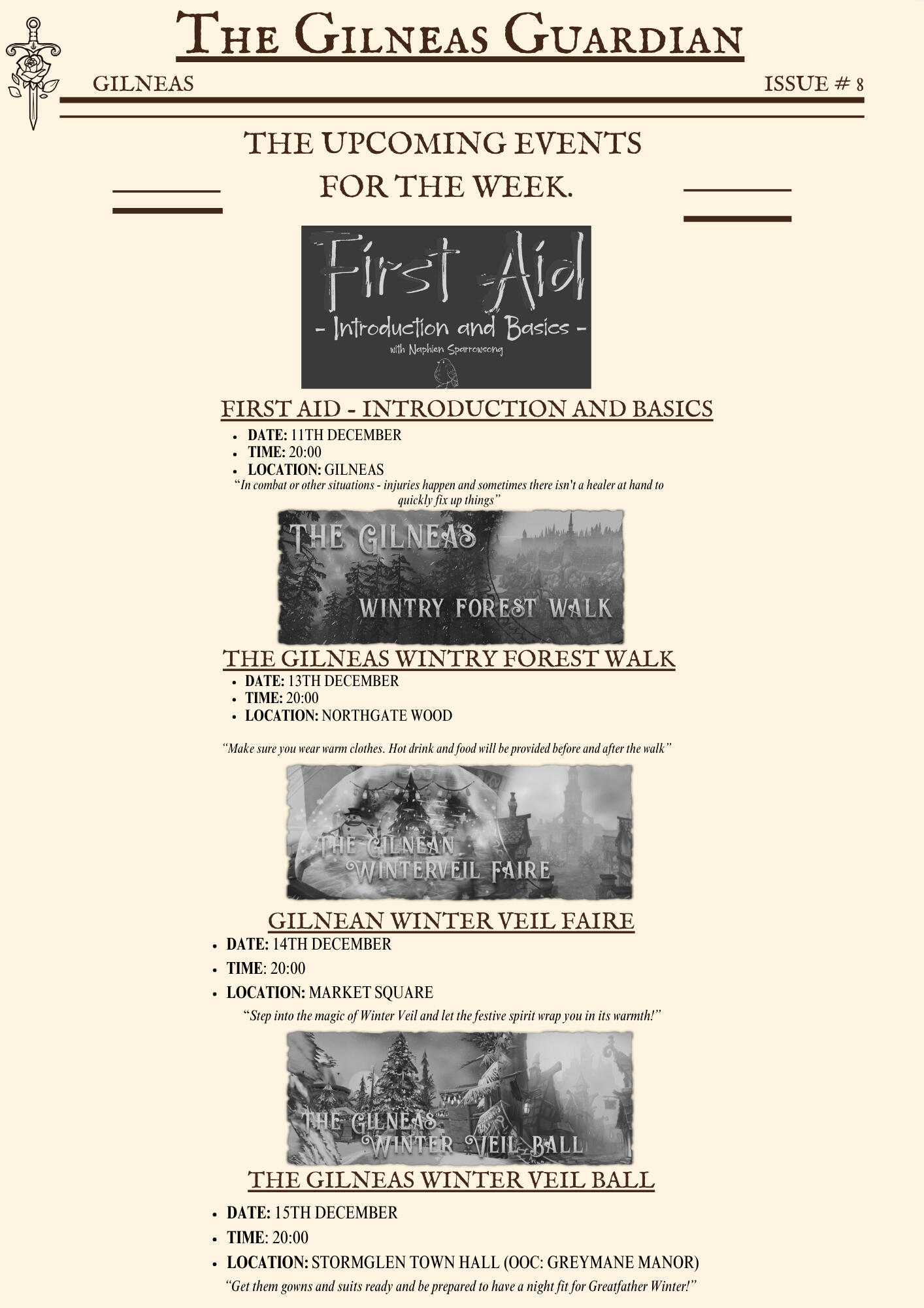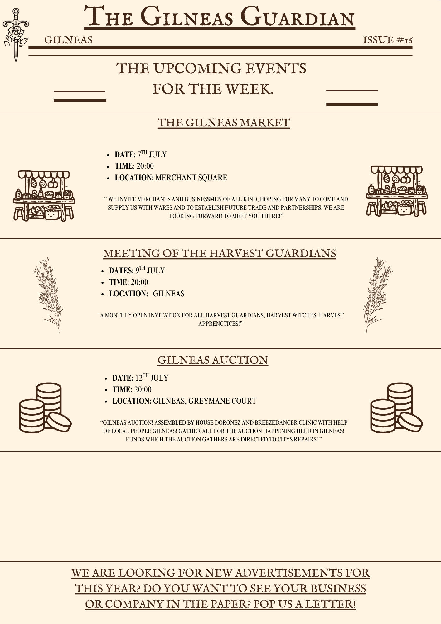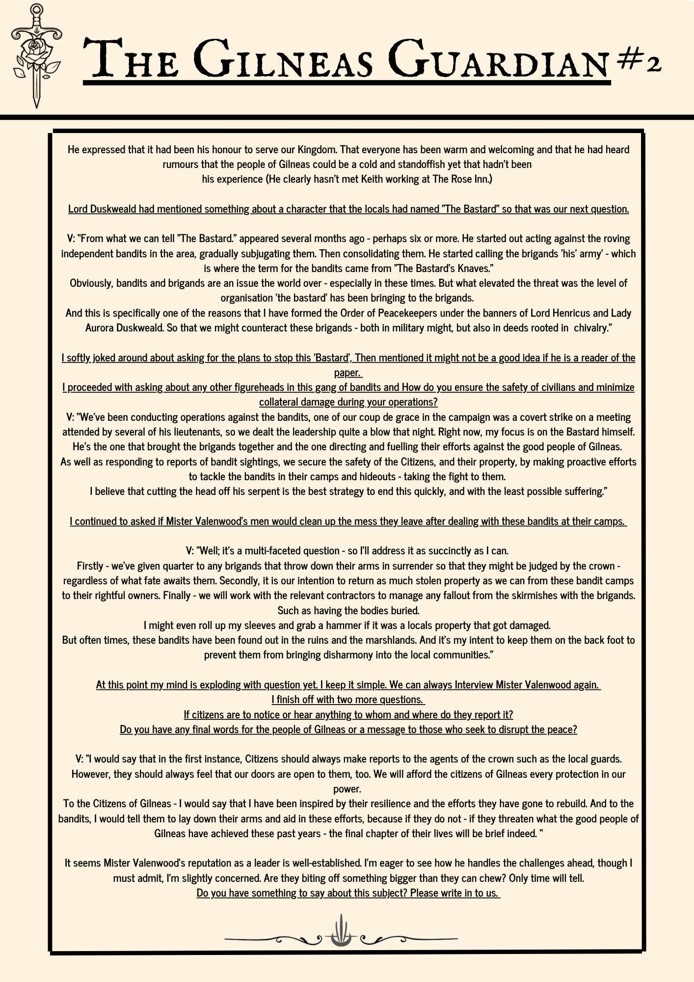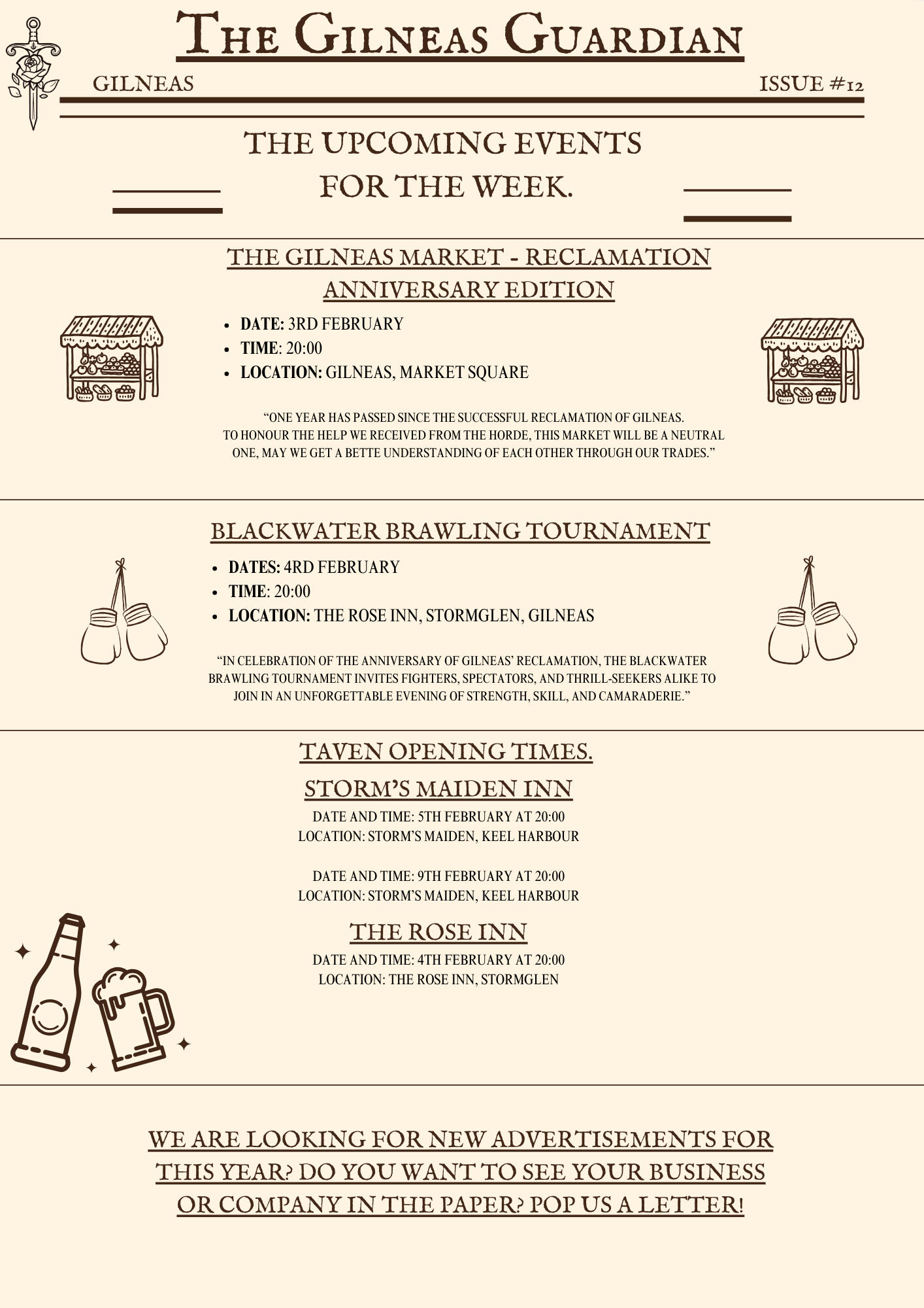 The Gilneas Guardian is dedicated to delivering truthful news and reporting on events in and around the city of Gilneas. Our mission is to keep citizens informed about the latest developments, ensuring the community stays aware and engaged with the world around them.